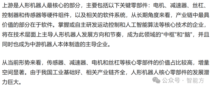 人形机器人产业链可分为上游核心零部件、中游本体制造和下游系统集成及应用,以下是各环节的拆解、对应的国内龙头上市企业,以及上游核心零部件来分析。